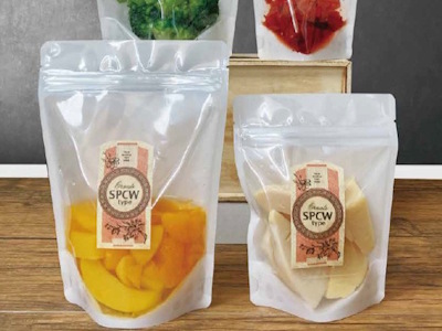 表面は透明で中身の色鮮やかさを際立たせ、裏面は白で陳列時の存在感をアピールできるチャック付きのスタンドパックです。