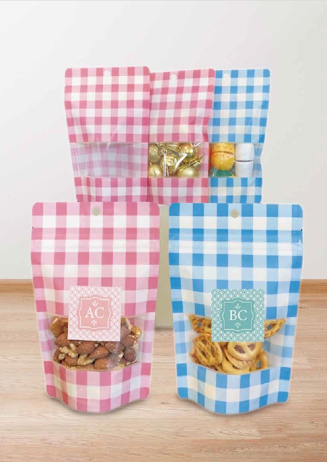チェック柄の印刷で表面に透明窓付きのチャック付きのスタンドパックです。