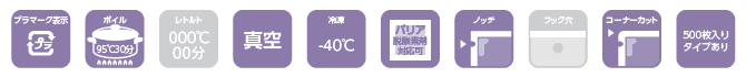 真空パックに対応で-40℃の冷凍から95℃30分のボイル殺菌にも対応しています。