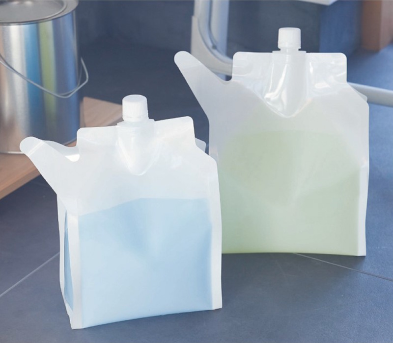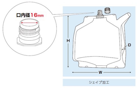 袋上部の中央部に口内径16mmの2ピースキャップが付いた白印刷のガゼットパックです。