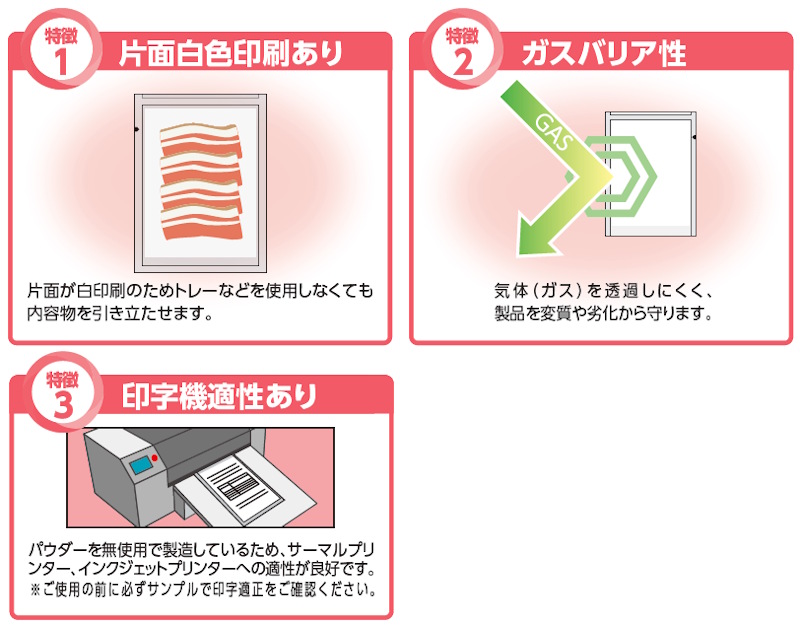 | 製品名 | 印字機適正 ガスバリア性 片面白印刷 三方袋 NMIJ-1523 |
