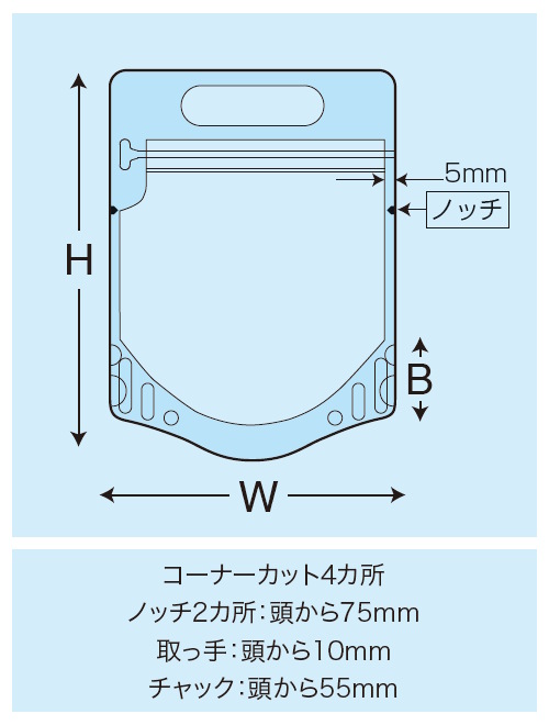 | 仕様 | 5mmサイドシール、コーナーカット、ノッチ付き、取っ手付き、チャック付き |